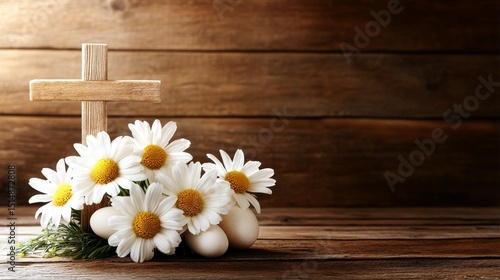 Naklejka premium Wooden Cross with White Daisies and Eggs on Rustic Wooden Surface