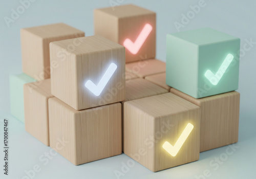 Obraz premium Wooden cubes with glowing checkmarks arranged in a playful, organized...