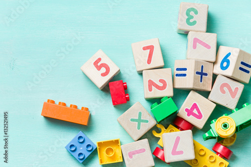 Obraz premium Wooden cubes with numbers and colorful toy bricks on a turquoise wooden...