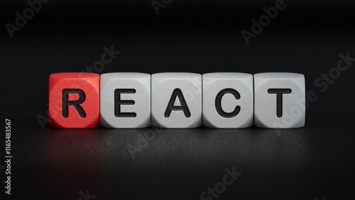 © feng, Obraz premium wooden cubes with text REACT. financial market. financing.close up of wooden elements,Business Concept.3D rendering on black background.