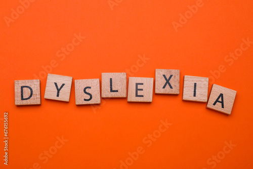 © New Africa, Obraz premium Wooden cubes with word Dyslexia on orange background, flat lay