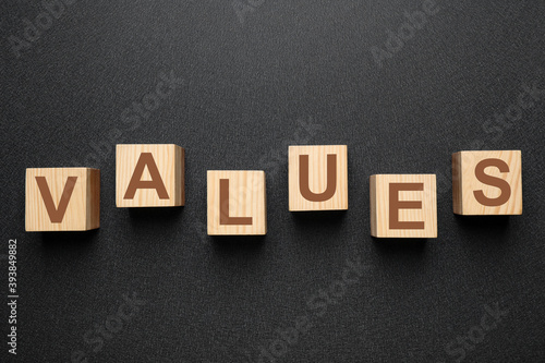 © New Africa, Obraz premium Wooden cubes with word VALUES on black background, flat lay