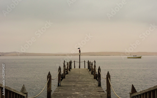 © Caio, Fototapeta premium wooden deck and bird in a misty day at Paracas beach. Ica/Peru.