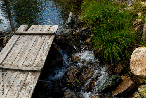 Obraz premium Wooden deck by a mountain stream