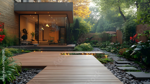 © Siasart Stock, Fototapeta premium Wooden Deck Patio With Stone Pathway 3D Illustration