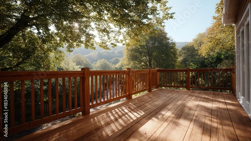 Naklejka premium Wooden deck with railing overlooking lush green forest, sun rays filtering...