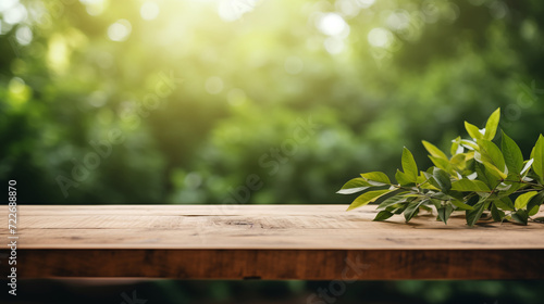 © Takayo Aun 87, Fototapeta premium Wooden Desk and Forest Background. Generative AI.