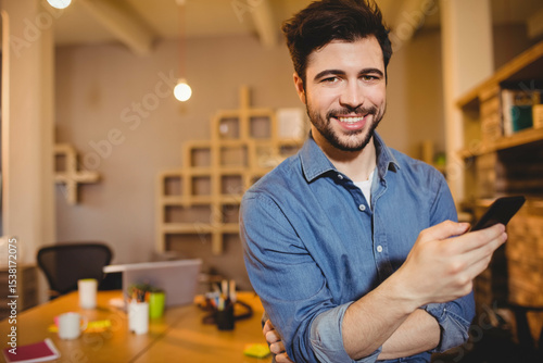 © WavebreakMediaMicro, Fototapeta premium Wooden desk displaying mugs, pencils, sticky notes, laptop beneath warm pendant lights in office