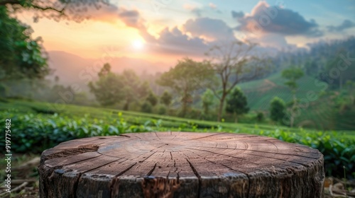Fototapeta premium Wooden desk or stump with blurred tea plantation and evening sky as frame for product display - nature background idea