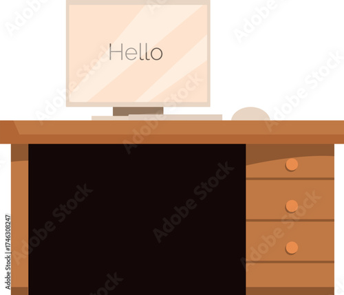 Fototapeta premium Wooden desk with computer showing hello message, representing a welcoming and productive workspace