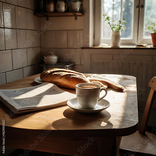 © Heru, Obraz premium Wooden dining table with breakfast setting in cozy natural light kitchen