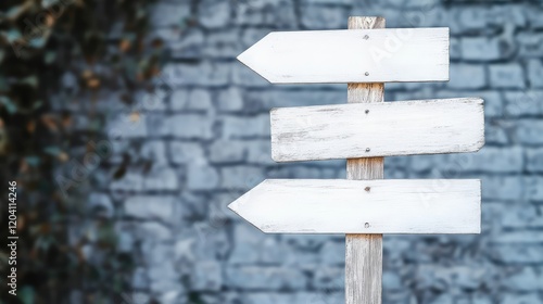 © pngking, Naklejka premium Wooden directional signpost with three blank white arrows on a weathered brick wall background with Copy Space for text placement