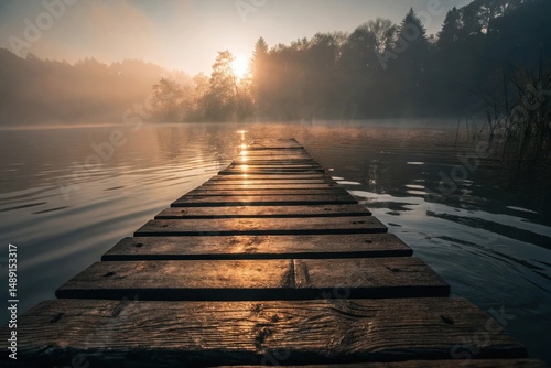 © Turzo Khan, Naklejka premium Wooden dock extending into a misty lake at sunrise