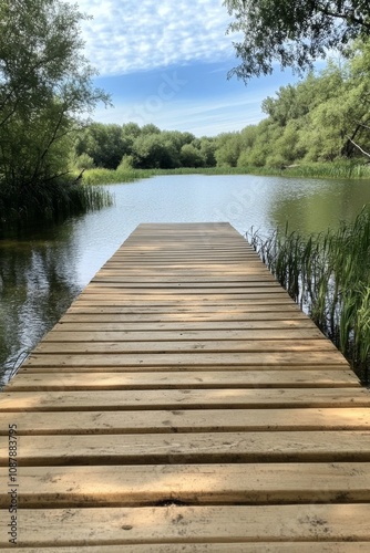 © olegganko, Fototapeta premium Wooden dock extending into calm water surrounded by lush greenery on a sunny day