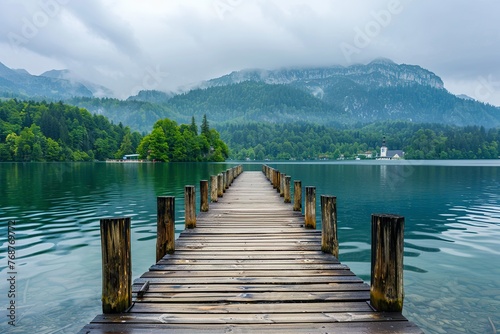 Naklejka premium Wooden Dock Extending Into Lake Bled, Slovenia