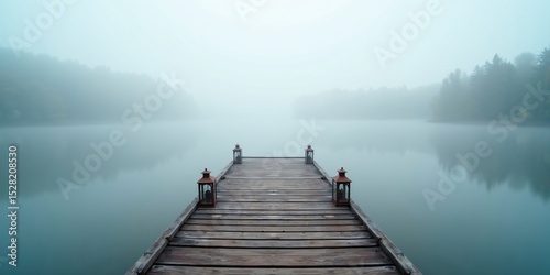 © dePICsignSTOCKS, Naklejka premium Wooden Dock Extending Into Misty Lake