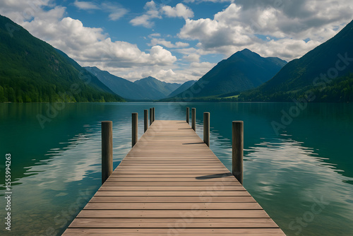 © Ziam Nova Studio, Fototapeta premium Wooden Dock Extending into Mountain Lake with Scenic Forest View