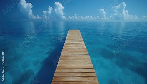 © Lhouis, Fototapeta premium Wooden dock extends into blue ocean, clear skies, and soft white clouds. Use to depict escape, serenity, vacation, or a journey into the unknown.