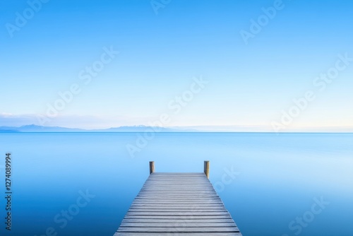 © zetrum, Fototapeta premium Wooden dock extends into calm, blue waters under a clear sky, mountains visible on the horizon