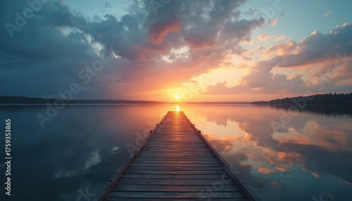 Naklejka premium Wooden dock extends into lake at sunset. Water reflects sky, sun. Serene...