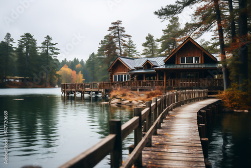 © Canvas Alchemy, Fototapeta premium Wooden dock next to large body of water