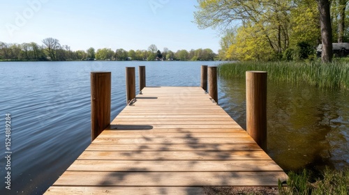 © sugi, Obraz premium Wooden Dock Over Still Lake Water on Sunny Day