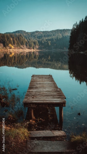 Fototapeta premium Wooden Dock Stretching into Serene Forest Lake