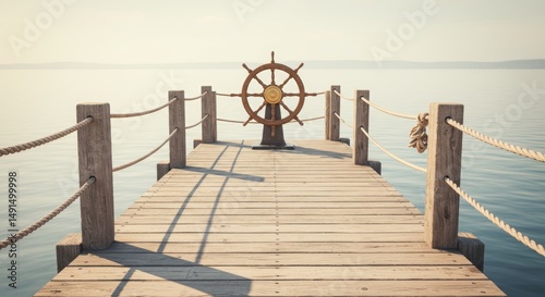 © Artshyafa, Fototapeta premium Wooden Dock with Ship Wheel at Calm Lake on a Sunny Day Serene Escape