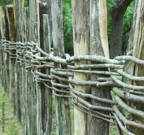 Fototapeta premium Wooden fence assembled of beams or logs old patched up woven wicker with bits...