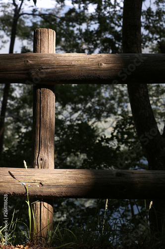 Fototapeta premium Wooden fence inside a wood. Parapet consisting of wooden poles in the Tuscan mountains.