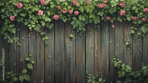 © arri, Fototapeta premium Wooden fence with vibrant flowers and lush green leaves growing over it