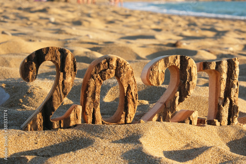 Fototapeta premium Wooden figures 2021 on the coast of the river, against the background of the sea. Place for your text.