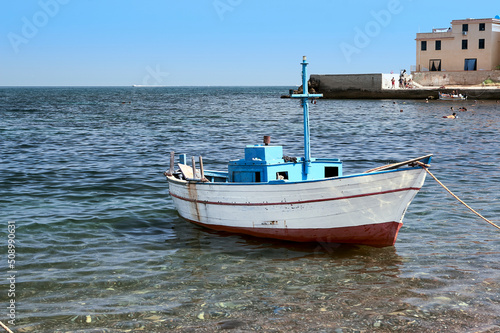 Fototapeta premium Wooden fishing boat moored in Sicily