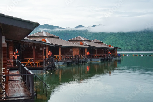 Naklejka premium wooden floating raft house resort by mountain Kanchanaburi, Thailand
