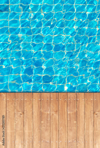 © tanatat, Obraz premium Wooden floor edge of swimming pool background