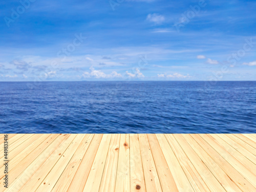 Fototapeta premium Wooden floor or plank on sand beach in summer. For product display.Calm Sea and Blue Sky Background.
