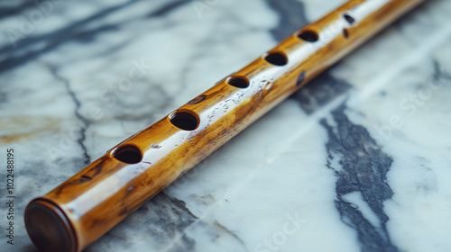 © VASSELL TRADING, Naklejka premium wooden flute closeup on marble surface