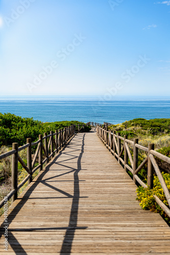 Obraz premium Wooden footbridge between dunes towards the Mediterranean Sea