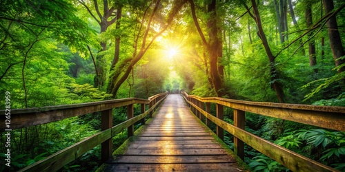 © prapatsorn, Fototapeta premium Wooden Footbridge Path in Forest - POV Landscape Photography