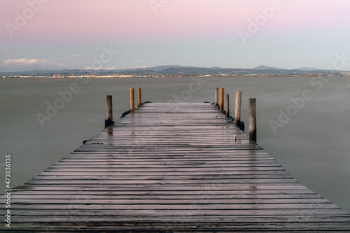 © MiguelAngel, Naklejka premium Wooden footbridge with moorings for boats, over the Albufera de Valencia.