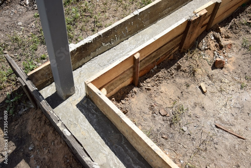 Obraz premium Wooden formwork concrete strip foundation for a veranda in a house.
