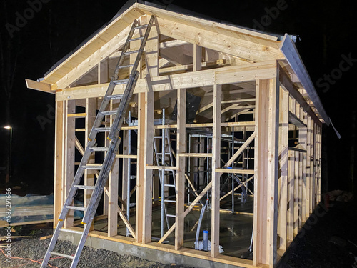 © ValeriyPH, Obraz premium Wooden frame of a house under construction on a universal Swedish plate