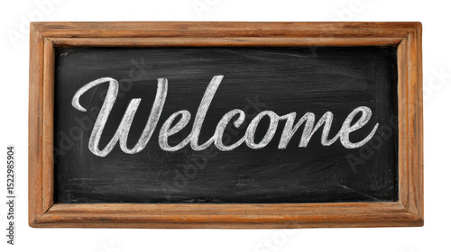 © Justlight, Obraz premium Wooden framed blackboard featuring the word welcome elegantly written in white chalk using cursive letters, set against a transparent background for versatile use in various settings