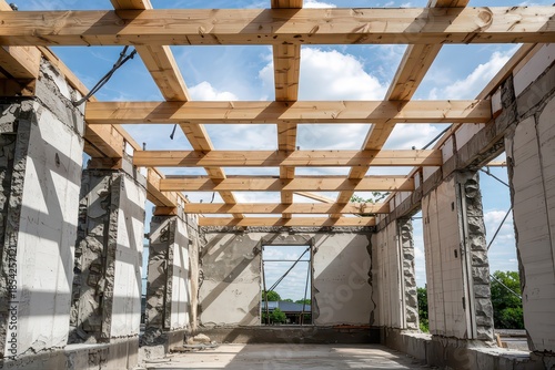 © Letitia, Obraz premium Wooden framework of a building under construction.