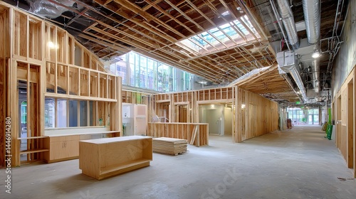 Fototapeta premium Wooden framing evolves into sleek kitchen cabinetry, blending raw structure...