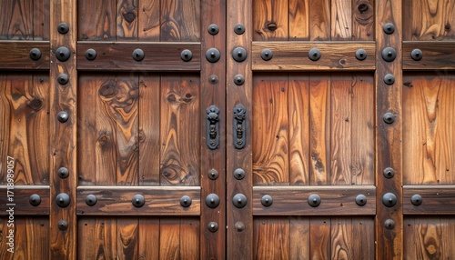 © kamandaka, Fototapeta premium Wooden gate with dark metal hardware