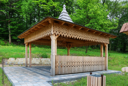 Fototapeta premium Wooden gazebo in beautiful city park.