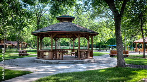 Naklejka premium Wooden Gazebo In Park With Lush Trees And Sunlight