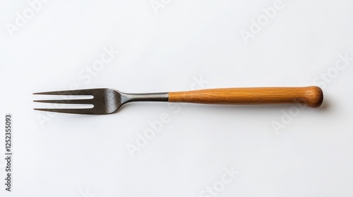 © muhammad, Fototapeta premium Wooden-handled fork on white background, food preparation (1)