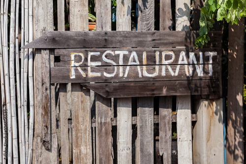 Fototapeta premium Wooden handmade sign restaurant on vintage plate